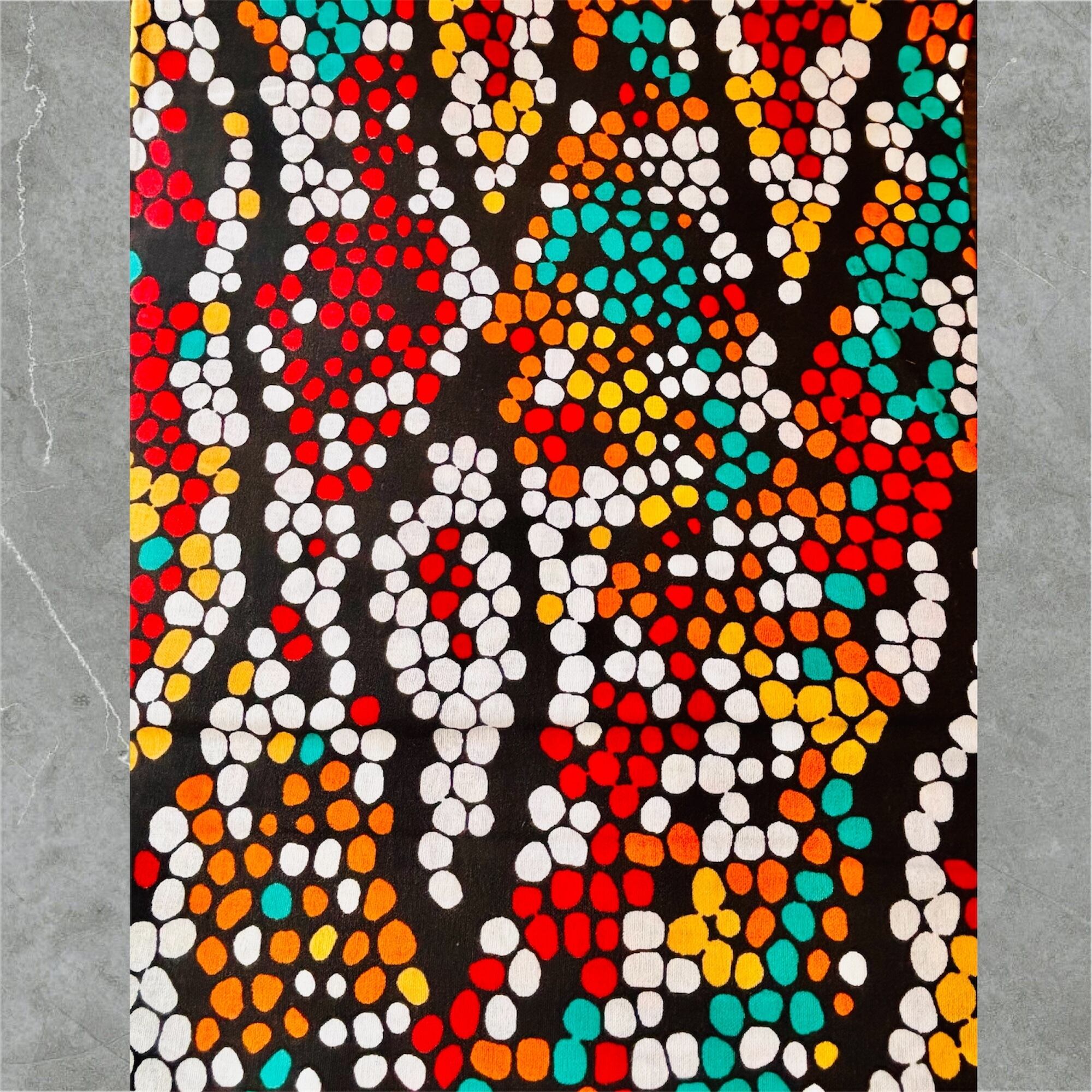 アフリカ布ならではの個性として、プリントのにじみやずれが見られる場合がありますが、これもこの布の味わいとしてお楽しみください。また、濡れた状態で他のものと重ねて放置すると色移りする可能性がありますので、お取り扱いにはご注意ください。